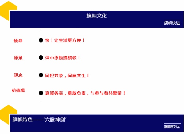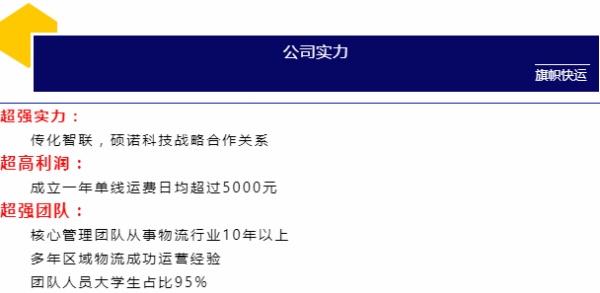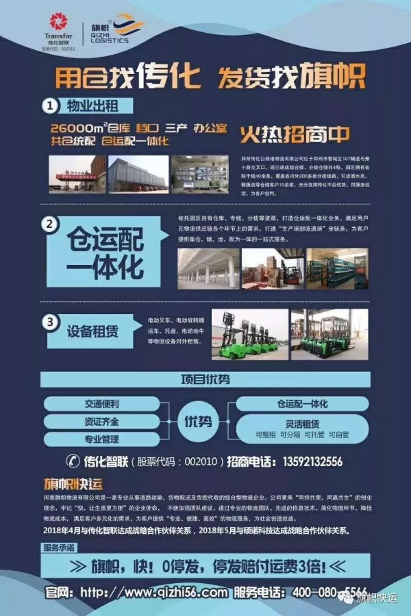 河南旗幟物流有限公司是一家從事道路運輸、貨物配送及貨款代收的綜合型物流企業,公司秉承“同擔共榮、同贏共生”的創業理念,牢記“快,讓生活更方便”的企業使命,不斷加強團隊建設,通過物流團隊、先進的信息技術、簡化物流環節、降低物流成本,滿足客戶多元化的需求,為客戶提供便捷的物流服務,為社會創造效益。